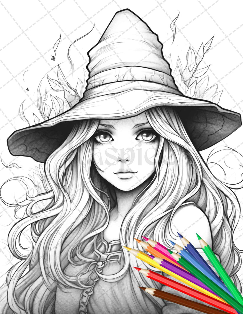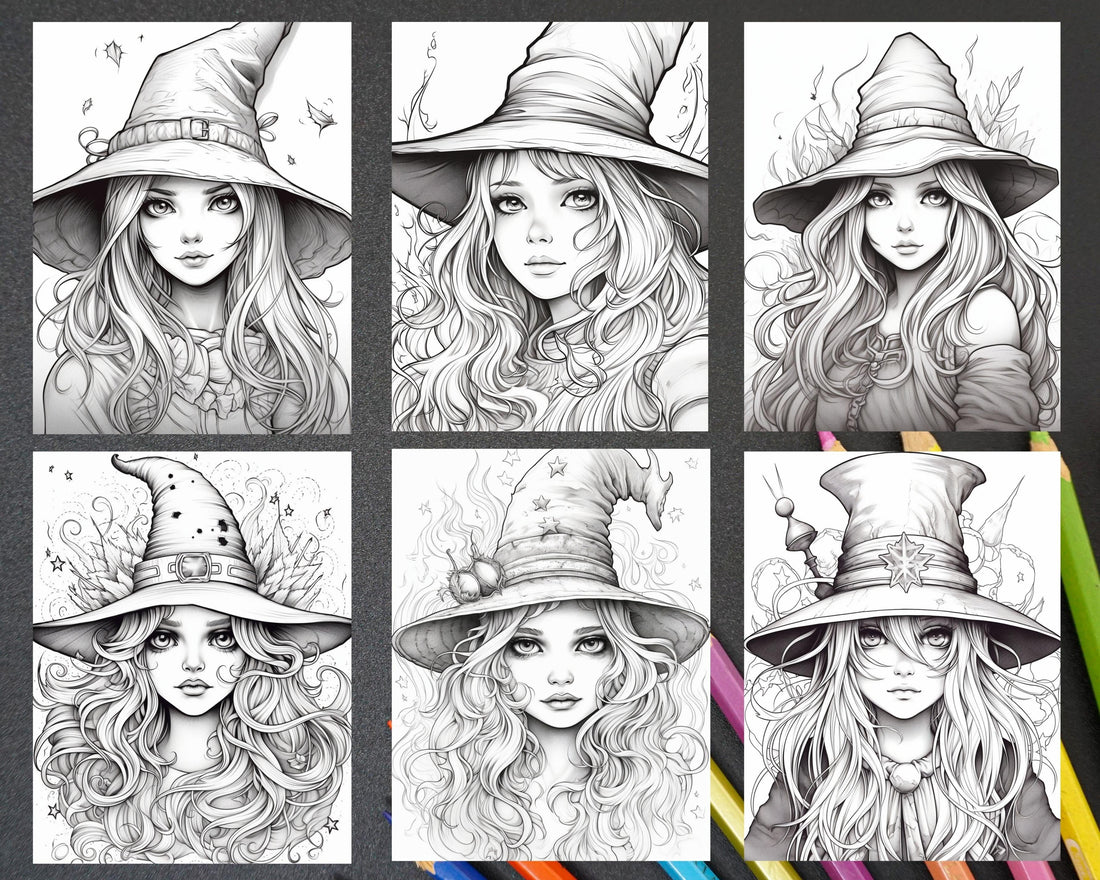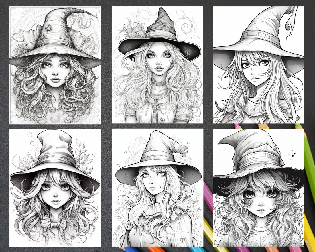60 Cute Witches Colouring Pages, Instant Download, Grayscale Colouring